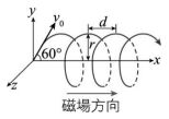 14. 一帶電質點以初速v₀由原點射入一平行於x軸的均勻磁場中,入射方向在XY平面,並與x軸夾60°,質點軌跡為一螺旋線,如圖所示。則螺旋線之半徑r與螺距d之比值為?