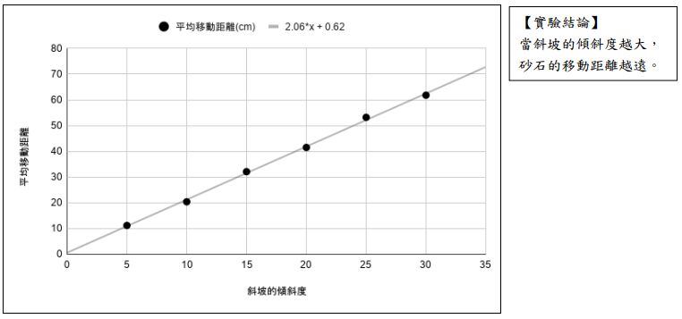 4. 下圖為兩位同學針對第二個操縱變因(斜坡的傾斜度)實驗的測量結果,請指出他們的實驗數據圖與結論有那些缺失?(3分)