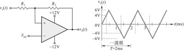 5. 施密特觸發電路的應用之一,是可以藉由其磁滯效應(hysteresis effect)將輸入的週期性信號轉換成週期性方波信號輸出。如圖電路中,假設運算放大器的輸出正負飽和電壓±Vsat=±12V,輸入電壓vs(t)為一週期性三角波信號,R₂=3R₁且Vref=0V時,下列措施,何者可有效提高輸出方波信號的頻率? (A)提高Vref值 (B)降低Vref值 (C)減少R₂/R₁的比值 (D)縮短三角波信號vs(t)的週期。