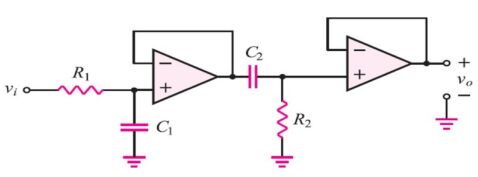3. 如圖所示主動式帶通濾波器,其高頻截止頻率為fH,低頻截止頻率為fL,若C₂=5C₁,R₂=4R₁,則fH/fL為?