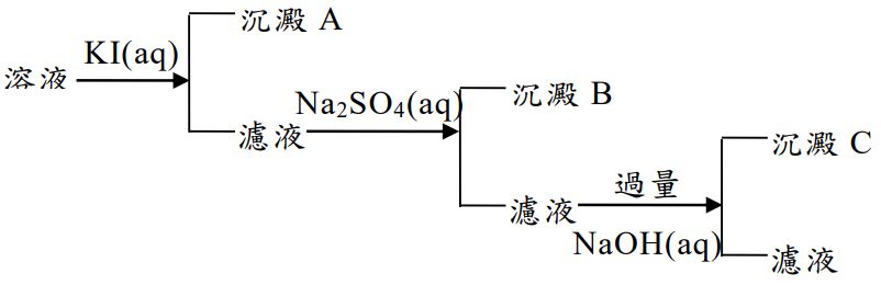 2. 某一溶液含有 Pb2+、Ba2+、Mg2+、Al3+四種離子,進行下列實驗,寫出沉 澱 A、B、C 的化學式及顏色。(化學式及顏色全對才給分)
