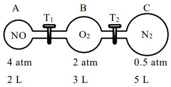 (2) 25℃時,A、B、C 三瓶為互通容器,中間以細管及活栓 T1、T2 相連, 各裝入 NO(g)、O2(g)及 N2(g)三種氣體,活栓 T1、T2 為關閉狀態,各 容器體積及壓力如下圖所示。同溫下,將活栓 T1 及 T 均打開始使容器相通。(細管體積忽略不計,玻璃球大小未依比例繪製)