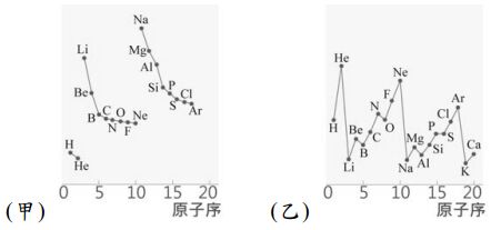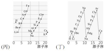 6.(2)附圖曲線分別表示元素的某種性質與原子序的關係或趨勢,若這五張圖的縱坐標 Y 可能為以下五項:(A)質子數、(B)價電子數、(C)半徑、(D)電負度及 (E)游離能,請依序寫出圖(甲)~(丁)的縱坐標 Y 之對應代號。