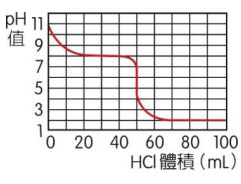 14. 若以 0.01 M 的鹽酸滴定 NaQ 的水溶液 50 mL 時,水溶液的 pH 值變化 如圖。