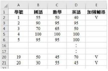 2. 如下圖所示,在 Excel 中若二科以上(含二科)不及格,在 E2 儲存格中設計公式顯示 V,其他狀況則不須顯示任何符號,再將該公式複製並貼到 E2:E21 範圍的儲存格中,使得這些儲存格有二科以上(含二科)不及格者顯示 V,則 E2 儲存格的公式為______________________________。