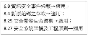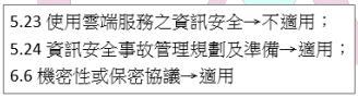 6. A 公司於執行風險評鑑過程,依據風險評鑑結果選擇適 切之資訊安全風險處理選項,並據以產生適用性聲明。請問有關部分之適用性聲明 內容,下列何者「有誤」? (A)(B)(C)(D)