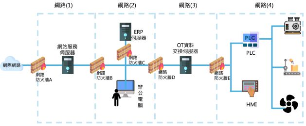 18. 附圖為智慧製造企業組織的網路架構圖,請問下列描述何者較「不」正確? (A)防火牆 A 至防火牆 E 的部署主要為了強化網路的縱深防禦 (B) 為特別加強防護,屬於 DMZ 網路的網路(2)及網路(4),應特別加強保護 (C) 為確保網路安全,可考慮採用實體隔離的技術(如 Air Gap)隔離 IT 與 OT 網路 (D)因網站服務需開放外部連線,因此需要在網路防火牆 A 設定開放網際網路至網 站服務伺服器的 HTTPS 協定