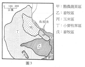 5. 根據學者的研究,農業土地利用的集約度,常呈現由市場向外隨距離增加而遞減的情形。圖3 是阿根廷彭巴地區的土地利用圖,根據前述的論點推測,作為本區農業主要市場的首要都市應該位於圖中的那一區? (A)甲 (B)乙 (C)丙 (D)丁 (E)戊