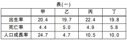 3.表(一)為甲、乙、丙、丁四地的部分人口資料(單位:千分比),由表可顯示該年人口外移最嚴重的是何地? (A)甲 (B)乙 (C)丙 (D)丁。