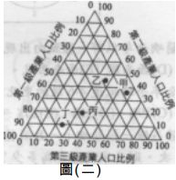 6.圖(二)是某個國家三級就業人口比例的三角圖解,甲-丁表示四個時期的就業結構,若 該國現在是進步的已開發國家,則其就業結構比例的變遷順序應為何?