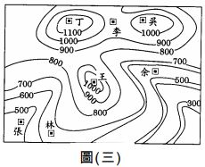 19.圖(三)為某些村落分布區之等高線地形圖,請問哪一姓氏的村落為取水方便及 防止淹水,將村落建在河階上?