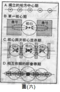 38.圖(六)是區域發展的空間整合模式圖,在圖中的單一核心期,若邊陲區的經濟發展愈來愈衰退,和下列哪些因素的關係較密切? (A)資金外流 (B)勞力外流 (C)勞動人口老化 (D)地方市場縮小 (E)天然資源枯竭。