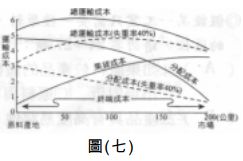 40.圖(七)是工業區位與運輸成本分析圖,圖中分別有失重率近於零時的成本曲線,以及失重率為 40﹪時的成本曲 線。下列哪些敘述與此圖所顯示的概念相符合? (A)距市場 50 公里之處,分配成本比集貨成本高 (B)終端成本反映了場站成本 (C)失重率不大時的最佳設廠地點在市場 (D)失重率為 40﹪時,最佳設廠地點在原料產地 (E)圖中集貨成本的曲線,可同時代表「失重率近於零時」及「失重率為 40﹪ 時」的集貨成本。