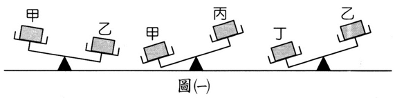 2. 如圖(一),利用等臂天平比較甲、乙、丙、丁四個物品的重量。請問甲、乙、丙、丁四個物品中哪一個重量最輕?