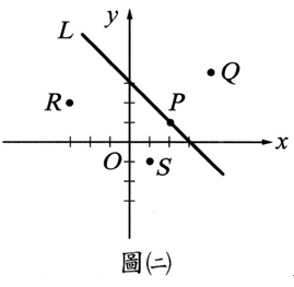 4. 如圖(二),直線L的方程式為x+y-3=0。請問P、Q、R、S四點中,哪一個點的坐標是此方程式的解?