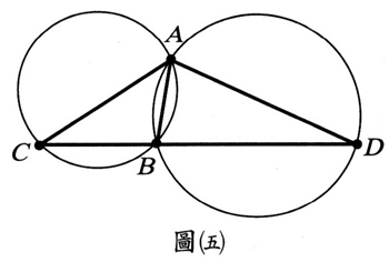 17. 如圖(五),兩圓相交於A、B兩點。若C、B、D三點共線,弧BC=90∘,弧ABC=160∘,則弧ABD=?