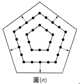 18. 如圖(六),有若干位學生排出正五邊形的隊形,由內而外共排了6圈,且學生人數剛好排完。已知最內圈每邊3人,往外每圈每邊增加2人(即由內向外算起第2圈每邊5人,第3圈每邊7人,…)。請問此隊形的學生共有多少人?