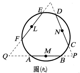 26. 如圖(九),圓上三弦 AB、 CD、EF ,欲在圓內找一點,使其到三弦的距離相等。下列四種做法中,哪一種是正確的?