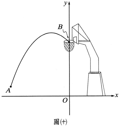 28. 圖(十)是一坐標平面。已知籃框位置B點在y軸上,今有一選手將球從A點的位置投出,球經過的路徑是拋物線,由B點空心進籃。若此拋物線是下列某一函數的圖形,則此函數為何?
