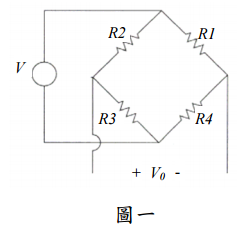 【已刪除】二、將四個電阻為 R 的應變規連接成電橋電路如圖一所示,平衡時電壓輸出 V