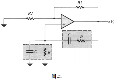 【已刪除】四、弦波振盪電路如圖二所示,請寫出其迴路增益,並推導產生振盪的條件。(20 分)