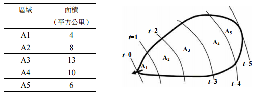 【已刪除】三、一集水區之等時線(isochrones,以小時計)如下圖所示。相鄰兩等時線間之集水面 積如下表。不考慮集水區地表之蓄水效應,計算該集水區三小時延時,1 公分有效降 雨之單位歷線(以立方米/秒表之)。(20 分)