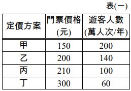 3. 臺灣許多自然風景區僅以門票為主要收入來源,業者希望遊客 眾多以提高利潤,但是為達成永續發展的目標,遊客人數實應 有所限制。有一面積為 2,500 公頃的風景區擬全年開放,經營 上需符合下列兩個條件:(1)每日平均每公頃遊客不應超過 1.6 人,(2)年營業收入最少應超過年維護成本(2 億元)的 10﹪,以 維持合理的利潤。表(一)為此風景區預估門票定價與遊客人數 關係表,若門票為唯一的收入來源,則經營者應選擇的門票定 價是表(一)中的哪個方案? (A)甲 (B)乙 (C)丙 (D)丁