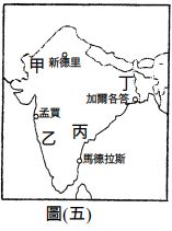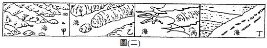 9. 東南丘陵是中國人口移出最多的僑鄉,其人口外移,和圖(二)中哪一種海岸地形的關係最密切? (A)甲 (B)乙 (C)丙 (D)丁