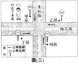 10.圖(三)是一張未標示方向的簡易地圖,路名如圖所示, 圖中的十字路口有甲乙丙丁四個公車站,所有的公車皆 靠右行駛直線。已知阿虎坐公車向東行,在青松路甲公 車站處下車,他打算到梅花路的北端去拜訪朋友。請 問:阿虎要到哪一個公車站轉車才正確? (A)甲站 (B)乙站 (C)丙站 (D)丁站