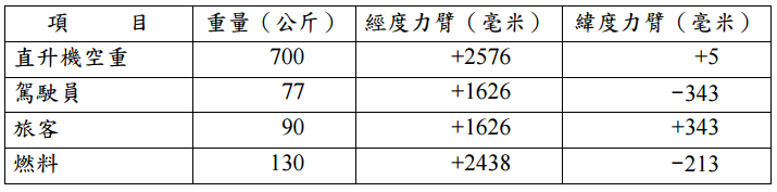 試根據上表,計算其重心位置。今欲在上表所列重量之外,增加重量為Wx公斤之壓 載物(ballast),其經度與緯度力臂分別為x毫米與y毫米,以使增加壓載物後直升 機重心之經度與緯度座標分別為xcg毫米與 0 毫米,試分析x與y。請以代數符號Wx與 xcg表示之。(20 分)
