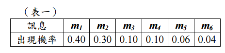 【已刪除】五、有訊息及其出現機率如(表一)所示,請畫出 Huffman Coding Tree,並加以編碼。 (20 分)