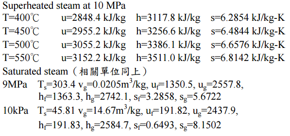 【已刪除】五、100 kg 水蒸氣以 9 MPa, 520℃及 20 m/s 推動蒸氣渦輪機,出口壓力為 10 kPa,速度 為 80 m/s,若蒸氣渦輪機的效率為 0.87,試計算其輸出之功。(25 分)