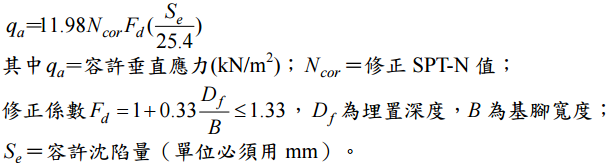 【已刪除】⑴若已知此基腳必須承受之垂直荷重為 Q=1600kN,假設基腳之容許沈陷量為 30mm,試用以下公式設計基腳寬度。(15 分) )
