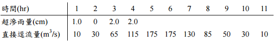 試求該集水區在超滲降雨強度為 10 cm/hr 且持續三小時情況下之直接逕流歷線。 (20 分)