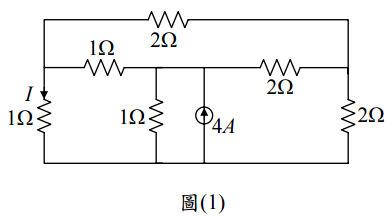 【已刪除】一、如圖(1)電路圖所示,有六個電阻分別為三個 1Ω與三個 2Ω以及一個獨立直流電流 源 4 A。求電流值 I。(20 分) 圖(1)