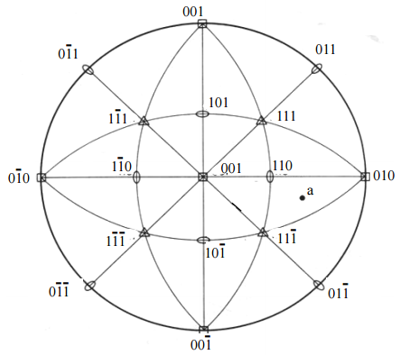 【已刪除】一、下 圖 是 一 個 面 心 立 方 ( FCC ) 晶 體 001 之 標 準 投 影 圖 ( stereographical projection)。假設圖中的點 a 代表拉伸應力的相對方位,請決定主滑移(primary slip)、 橫滑移(cross slip)、及共軛滑移系統(conjugate slip system)的平面及方向指數。 (10 分)