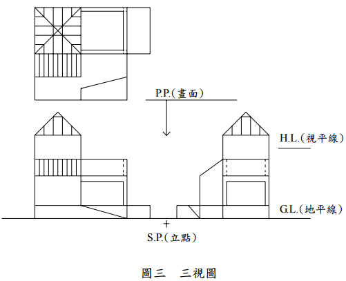 【已刪除】四、試依下列三視圖(圖三)之條件,繪製一消點透視圖。(20 分) 注意:繪圖時各項尺寸,請由圖三直接量測。
