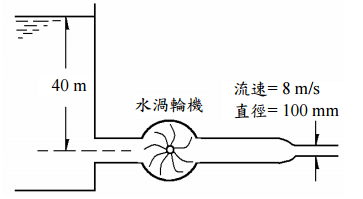 【已刪除】一、如圖示之水櫃液面一直維持在高於水渦輪機軸心高度 40m 處,管路排水口直徑為 100 mm,於此段排水管內之流速為 8 m/s,請計算此水渦輪機輸出之功率。(25 分)