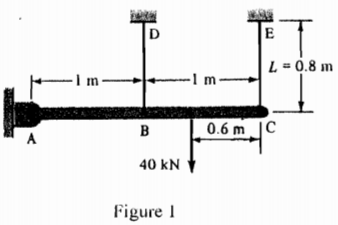 【已刪除】1. A rigid horizontal bar is supported by a hinge al A and by two steel cables BD and CE, which are of equal length L = 0.8 m,cross-sectional area A = 140 mm2, and E ~ 200 GPa. Please calculate the stress in each cable due to a force of 40 kN, applied as shown in Figure I. (20%)
