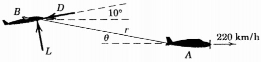 【已刪除】4. The 200-kg glider B is being towed by airplane A, which is flying horizontally with a constant speed of 220 km/h. The low cable has a length r = 60 m and may be assumed to form a straight line. The glider is gaining altitude and when θ reaches 15°, the angle is increasing at the constant rate θ