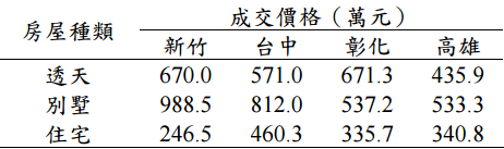 【已刪除】二、下表為某年某月調查到在新竹、台中、彰化、高雄四個地區的之房屋平均售價: