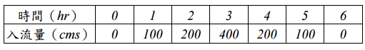 【已刪除】⑵以某一入流量之資料如下表所示,其中K=1.21 hr,並以∆t =1hr,計算出流量。(10分)