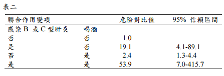 【已刪除】五、表二是一個研究肝癌發生與肝炎及喝酒之間關係之配對病例對照研究。根據研究分 析結果,請說明感染 B 或 C 型肝炎與喝酒對肝癌發生是否有加乘之作用(synergistic effect)?如果有,就預防肝癌的發生,這研究結果於公共衛生的意涵。(20 分)