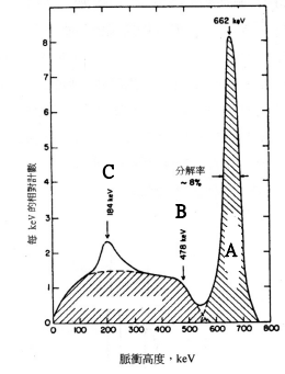 【已刪除】4.下圖為 NaI (T1)偵檢器度量到的能譜圖,請問此為那一種核種的能譜? 請說明 能譜標示 A、B、C 三處的名稱與物理意義?(12 分)