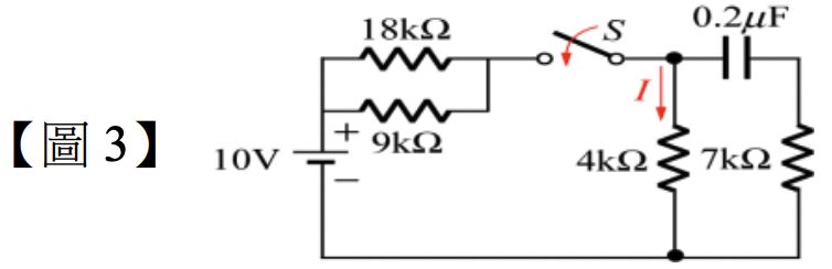 14.在【圖3】中,設開關S閉合前,電容器無能量,求開關S閉合後,4kΩ電阻所流過 之穩態電流 I 為多少mA? (A) 0.25 (B) 0.4 (C) 0.8 (D) 1