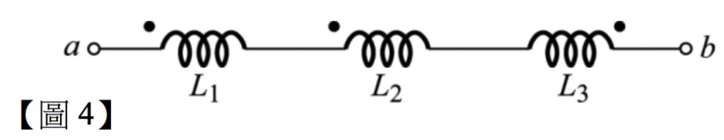 16.三線圈串聯如【圖4】所示,設L1=10亨利,L2=15亨利,L3=12亨利,M12=5亨利,M23=3亨利,M31=1亨利,則其等效總電感為: (A) 19H (B) 34H (C) 39H (D) 46H