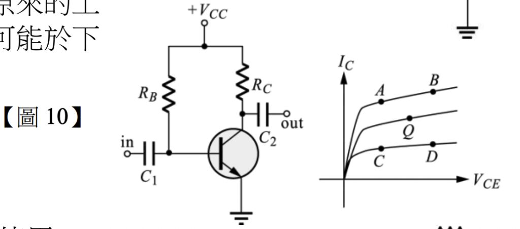 62.如【圖10】所示電路及電晶體之特性曲線,假設電晶體原來的工作點為Q點,則當RB電阻值變大時,其新的工作點將可能於下列哪一點?(A) A點 (B) B點 (C) C點 (D) D點
