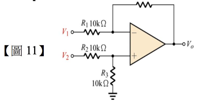 63.如【圖11】所示電路,若V1=+2伏特,V2=-4伏特,使用 理想運算放大器,則輸出電壓VO為: (A)-6V (B) 0V (C)+2V (D)+6V