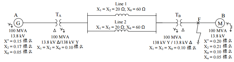 ,供電給一部同步電動機 B。同步電動機 B 之中性 線經由一大小為 0.05 標么之電抗 X