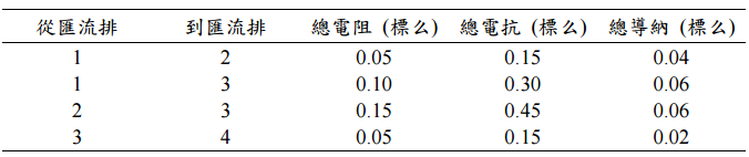 【已刪除】二、如下圖所示之電力系統,圖中各輸電線的參數如下表所示。請以 π 型等效輸電線電 路,並依圖中所標示的滙流排編號,建立出該系統之滙流排導納矩陣(Bus Admittance Matrix)。(20 分)
